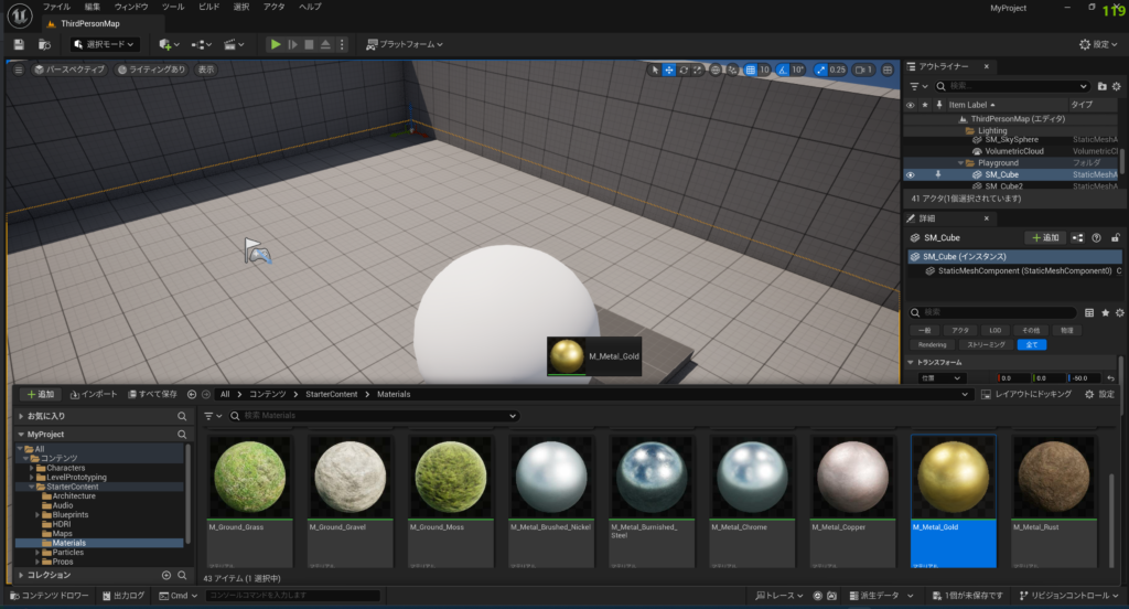 模様を付けます。コンテンツドロワー→StarterContent→Materialsをクリックすると一覧が出ます。