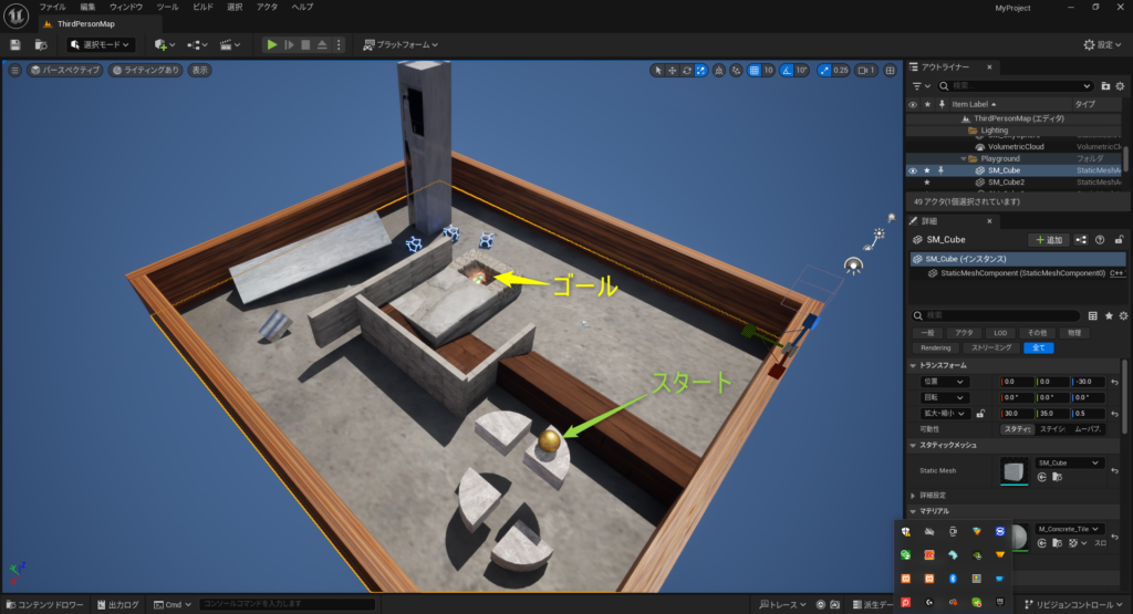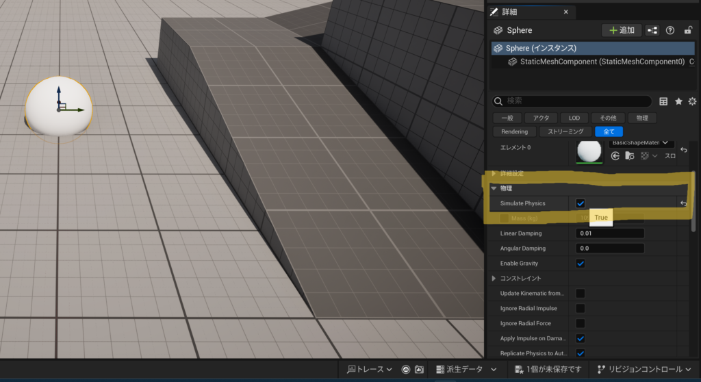 アイテムは選択してから画面右の詳細→物理→Simulate Physicsにチェックを入れると押したり転がしたり物理(Physics)をシミュレート(Simulate)できるようになります。