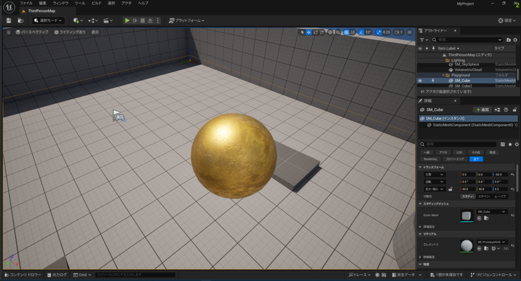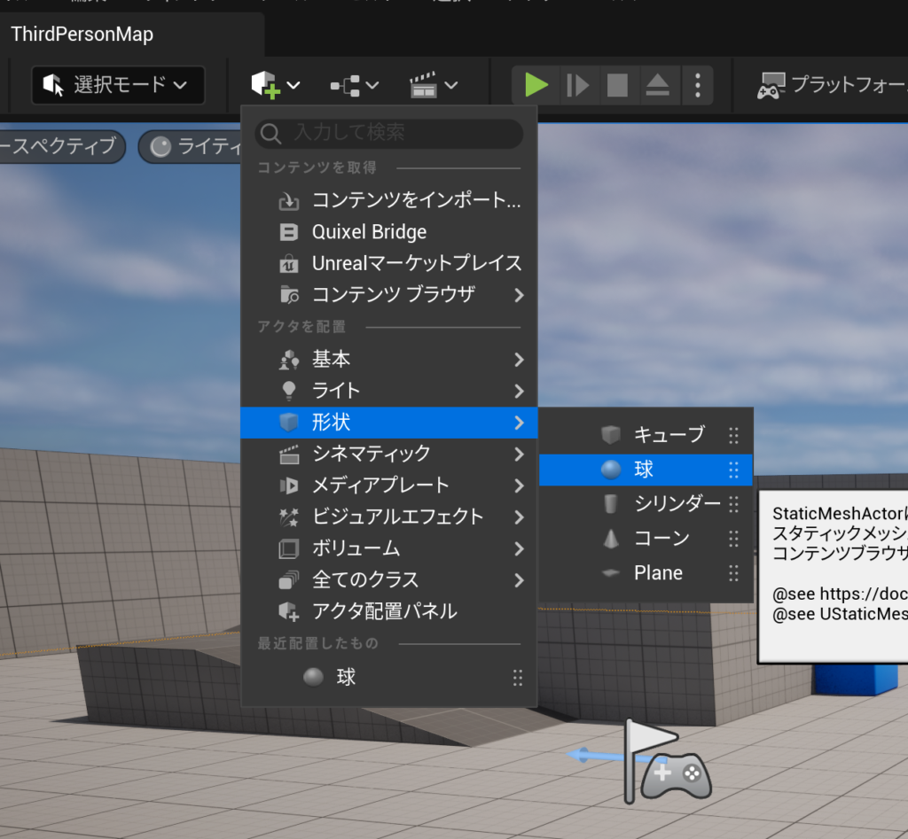 +、形状、形を選ぶとアイテムが追加されます。(今回は球を選びます。)